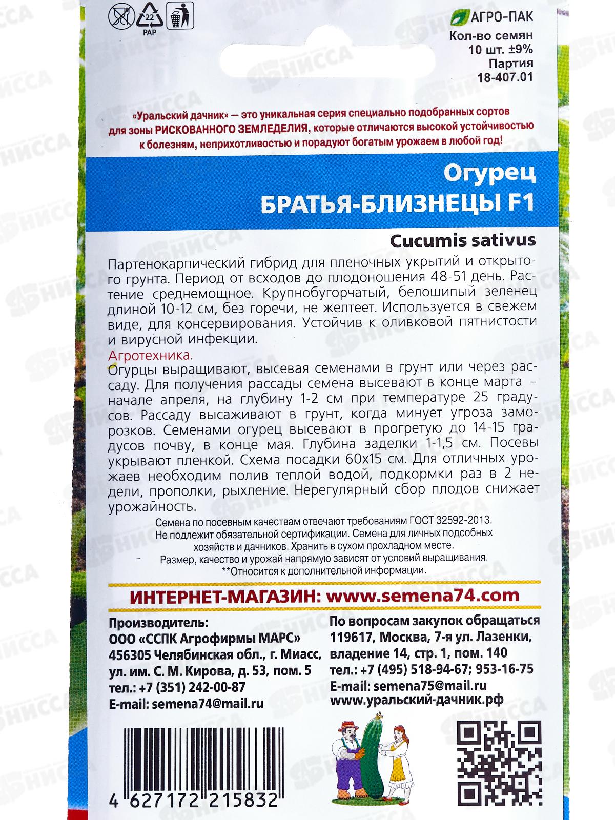Партенокарпический гибрид для плёночных укрытий и открытого грунта. Период от всходов до плодоношения 48-51 день. Растение среднемощное. Крупнобугорчатый, белошипый зеленец длиной 10-12 см, без горечи, не желтеет. Используется в свежем виде, для консервирования. Устойчив к оливковой пятнистости и вирусной инфекции. Огурцы выращивают, высевая семенами в грунт или через рассаду. Для получения рассады семена высевают в конце марта – начале апреля, на глубину 1-2 см при температуре 25 °С. Рассаду высаживают в грунт, когда минует угроза заморозков. Семенами огурец высевают в прогретую до 14-15 °С почву, в конце мая. Глубина заделки 1-1,5 см. Посевы укрывают плёнкой. Схема посадки 60 х 15 см. Для отличных урожаев необходим полив тёплой водой, подкормки раз в 2 недели, прополки, рыхление. Нерегулярный сбор плодов снижает урожайность.