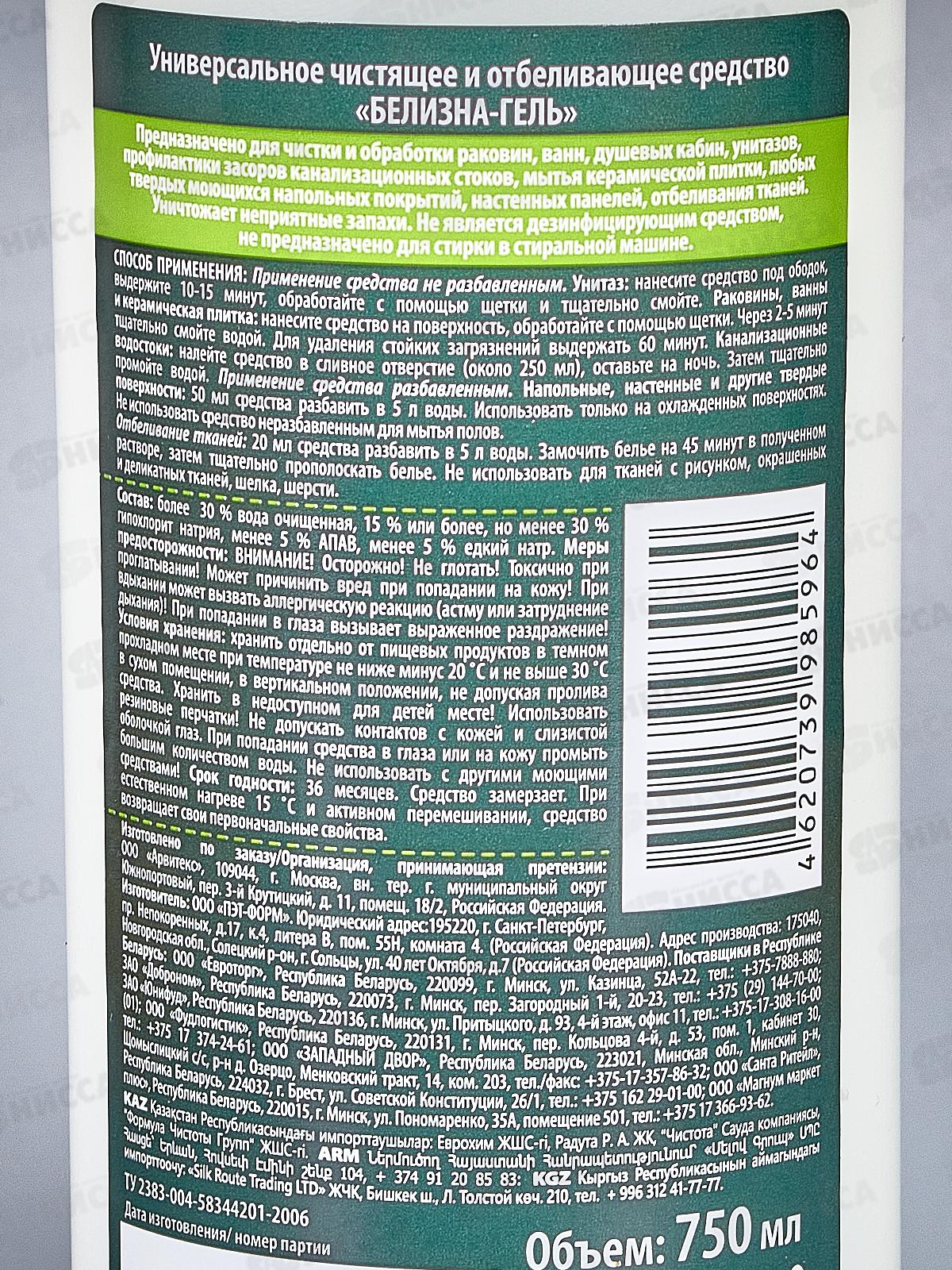 Состав: 30% вода очищенная, 15-30% гипохлорит натрия, 5% АПАВ, 5% едкий натрий