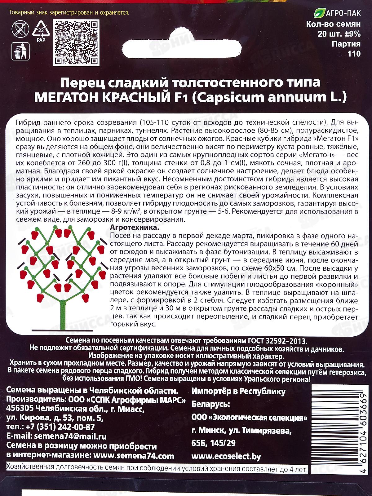 Гибрид раннего срока созревания. Для выращивания в теплицах, парниках, туннелях. Растение высокорослое (80-85 см), мощное. Плоды гибрида Мегатон F1 сразу выделяется на общем фоне, плоды его величественно висят по периметру куста крупными ровными тяжёлыми крупными кубами, гладкие, глянцевые. Плоды одни из самых крупных среди цветных перцев, вес их колеблется от 260 до 300 г (!), толщина стенки от 0,8 до 1 см(!), мякоть брызжуще-сочная, необыкновенно вкусная и ароматная. В собранном Вами урожае плоды перца будут "равны как на подбор" – один к одному крупные, толстостенные, вкусные и полезные. Выращивание этого гибрида доставит Вам большое эстетическое удовольствие. У плодов плотная кожица, они отличаются отличной транспортабельностью, Вы сможете перевозить их на любые расстояния, так как плотная кожица препятствует повреждению плодов, поэтому они ещё и долго хранятся. Несомненным достоинством гибрида является высокая пластичность: он способен приспосабливаться к крутому нраву российской погоды. Благодаря плотной кожице, плоды переносят легкие заморозки осенью, в то время как плоды других сортов с нежной кожицей повреждаются. Комплексная устойчивость к болезням, присущая гибриду, повышает гарантированность получения урожая. Рекомендуется для использования в свежем виде и консервирования.