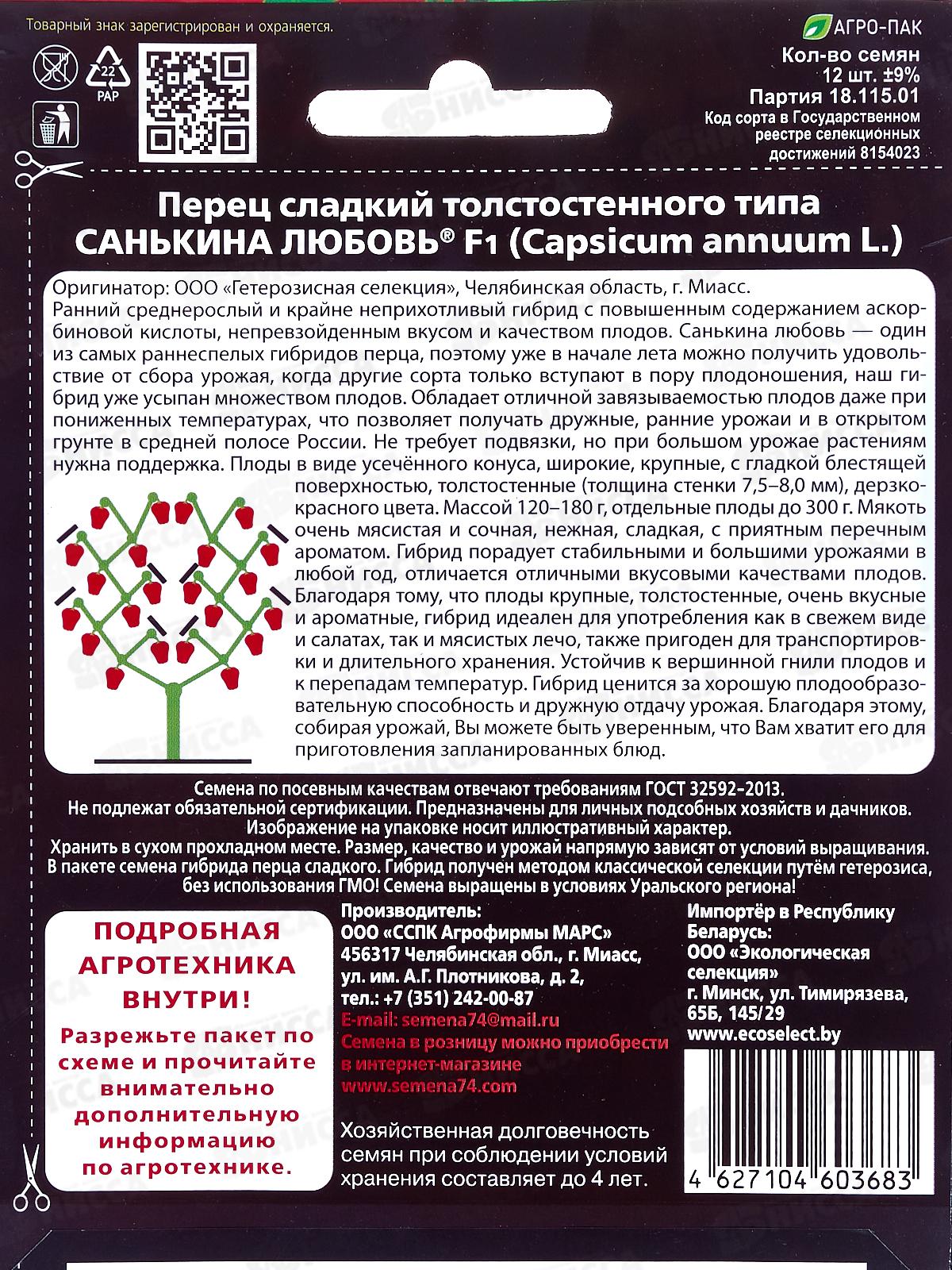 Ранний среднерослый и крайне неприхотливый гибрид с повышенным содержанием аскорбиновой кислоты, непревзойденным вкусом и качеством плодов. «Санькина любовь» – один из самых раннеспелых гибридов перца, поэтому уже в начале лета Вы сможете получить удовольствие от сбора урожая, когда другие сорта только вступают в пору плодоношения, наш гибрид уже усыпан множеством плодов.