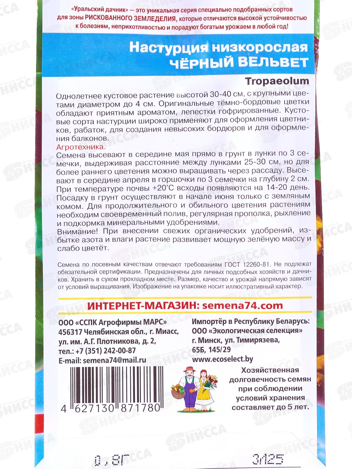 Однолетнее кустовое растение высотой 30-40 см, с крупными цветами диаметром до 4 см. Оригинальные темно-бордовые цветки обладают приятным ароматом, лепестки гофрированные. Кустовые сорта настурции широко применяют для оформления цветников, рабаток, для создания невысоких бордюров и для оформления балконов. Семена высевают в середине мая прямо в грунт в лунки по 3 семечки, выдерживая расстояние между лунками 25-30 см, но для более раннего цветения можно выращивать через рассаду. Высевают в середине апреля в горшочки по 3 семечки на глубину 2 см. При температуре почвы +20 C всходы появляются на 14-20 день. Посадку в грунт осуществляют в начале июня только с земляным комом. Для продолжительного и обильного цветения растениям необходим своевременный полив, регулярная прополка, рыхление и подкормка минеральными удобрениями. Внимание! При внесении свежих органических удобрений, избытке азота и влаги растение развивает мощную зеленую массу и слабо цветёт.