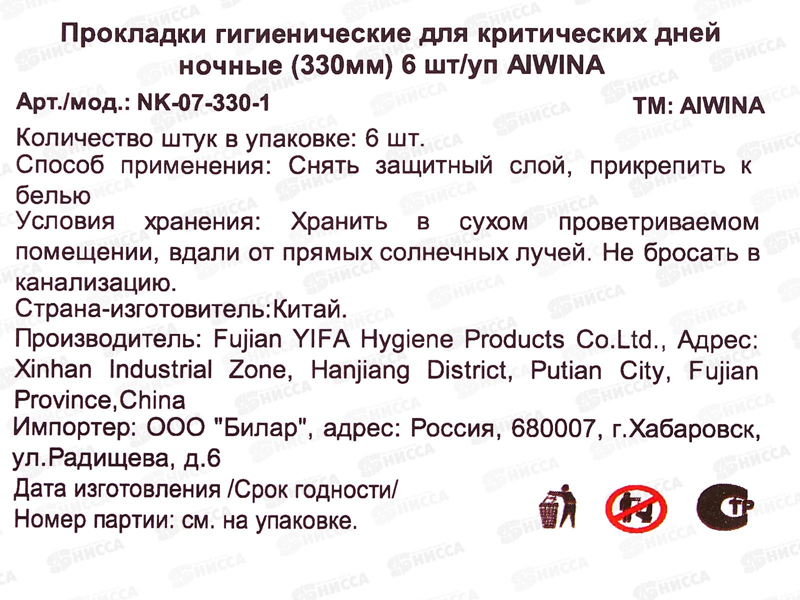Aiwina прокладки гигиенические ночь 6шт 33см *48