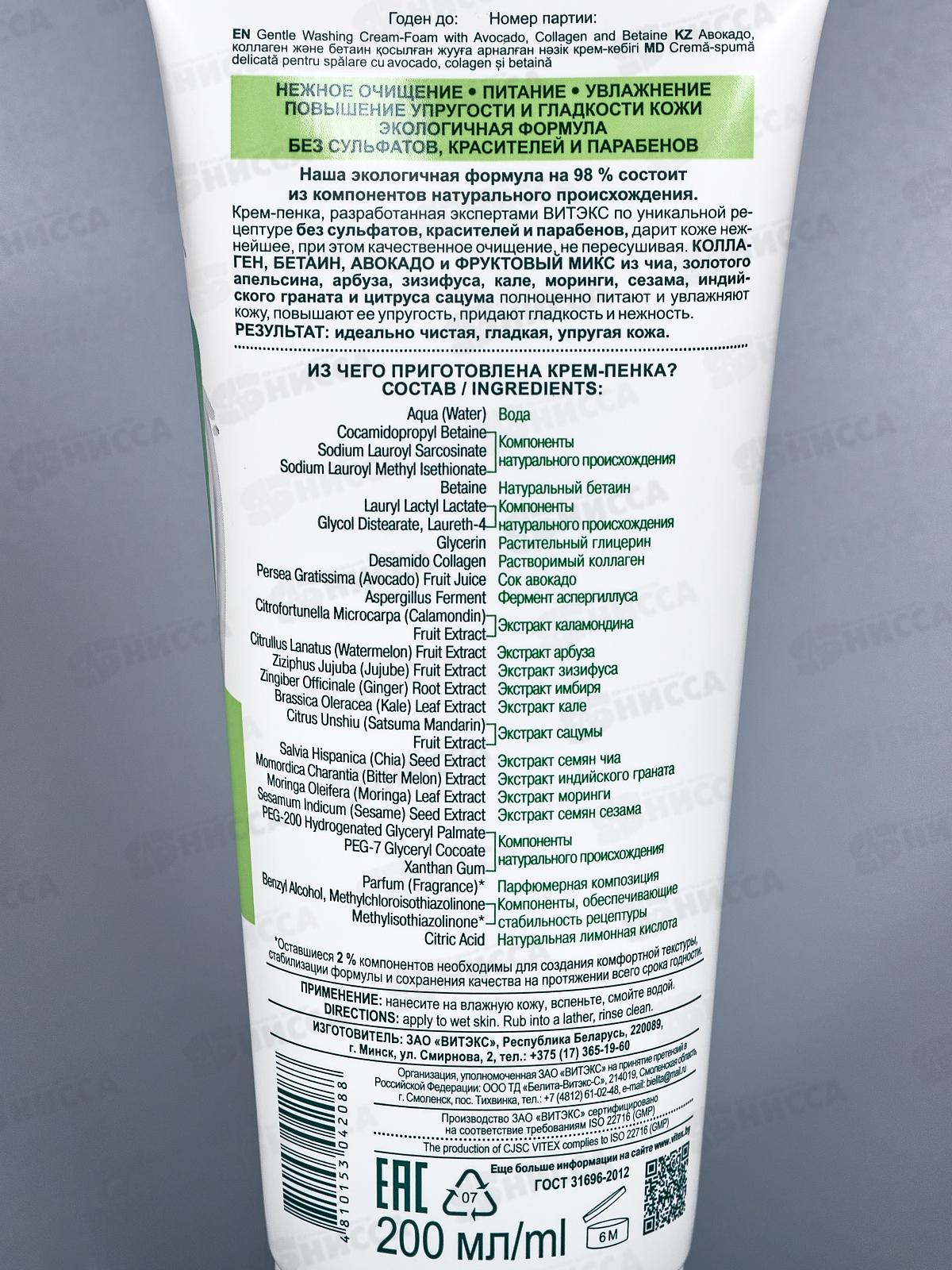 Крем-пенка, разработанная экспертами ВИТЭКС по уникальной рецептуре без сульфатов, красителей и парабенов, дарит коже нежнейшее, при этом качественное очищение, не пересушивая. Состав: вода, кокамидопропилбетаин, лауроилсаркозинат натрия, лауроилметилизетионат натрия, бетаин, лауриллактиллактат, гликольдистеарат, лаурет-4, дезамидоколлаген, сок плодов Persea gratissima (авокадо), фермент аспергиллуса, экстракт плодов Citrofortunella Microcarpa (каламондина), экстракт плодов Citrullus Lanatus (арбуза), экстракт плодов Ziziphus Jujuba (зизифуса), экстракт корня Zingiber Officinale (имбиря), экстракт листьев Brassica Oleracea (кале), экстракт плодов Citrus Unshiu (сацумы), экстракт семян Salvia Hispanica (чиа), экстракт Momordica Charantia (индийского граната), экстракт листьев Moringa Oleifera (моринги), экстракт семян Sesamum Indicum (сезама), ПЭГ-200 гидрогенизированный глицерилпальмат, ПЭГ-7 глицерилкокоат, ПЭГ-150 дистеарат, парфюмерная композиция, лимонная кислота, бензиловый спирт, метилхлоризотиазолинон, метилизотиазолинон.