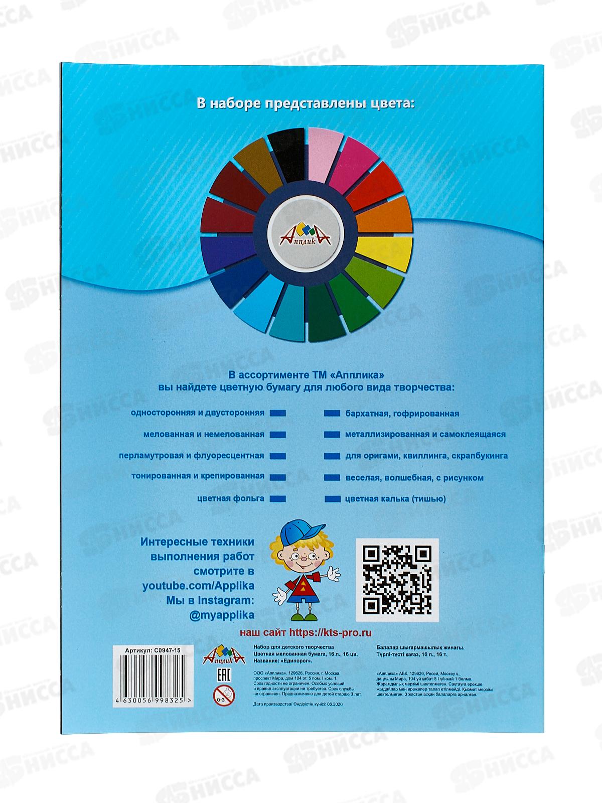Цветная бум. 16л 16цв Апплика мел Единорог С0947-15*50