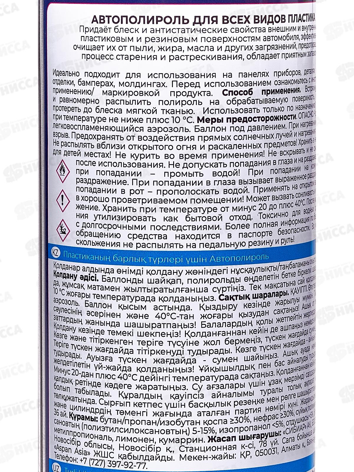 Состав: бутан/пропан/изобунан - 30%, нефрас - 30%, полиметилсилоксановая (или полидиметилсилоксановая) жидкость - 5 - 15%, изопропанол - 5%, отдушка - 5%.