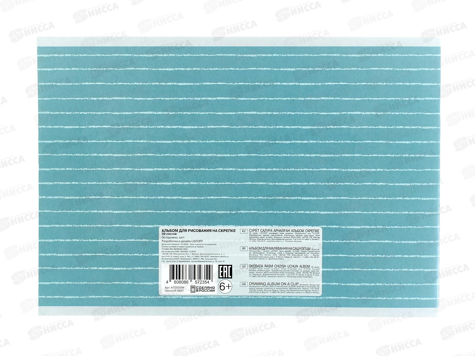 Альбом д/рис.30л ЭКСМ Осторожно,кот. скрепка. мел.картон АЛ302594 *50
