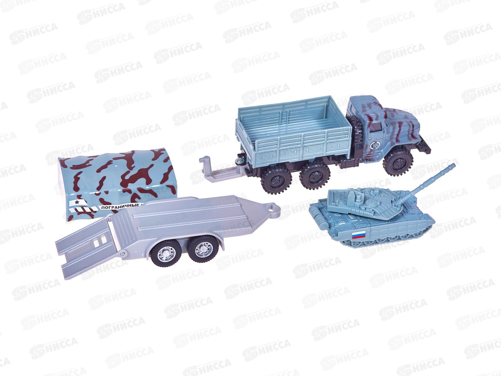 Встроен инерционный механизм. Он позволяет задать транспорту скорость и даёт возможность двигаться самостоятельно, по инерции. Прицеп отсоединяется. Танк можно скатить по трапу. Тент снимается с кузова. Масштаб модели — 1:43. Размер грузовика: 12х4х5 см. С прицепом: 23х4х5 см. Размер танка: 9х3,5х3 см.