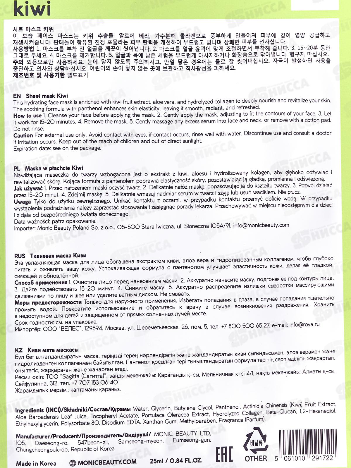 MONIC BEAUTY Тканевая маска для лица Киви, 24мл (*10)
