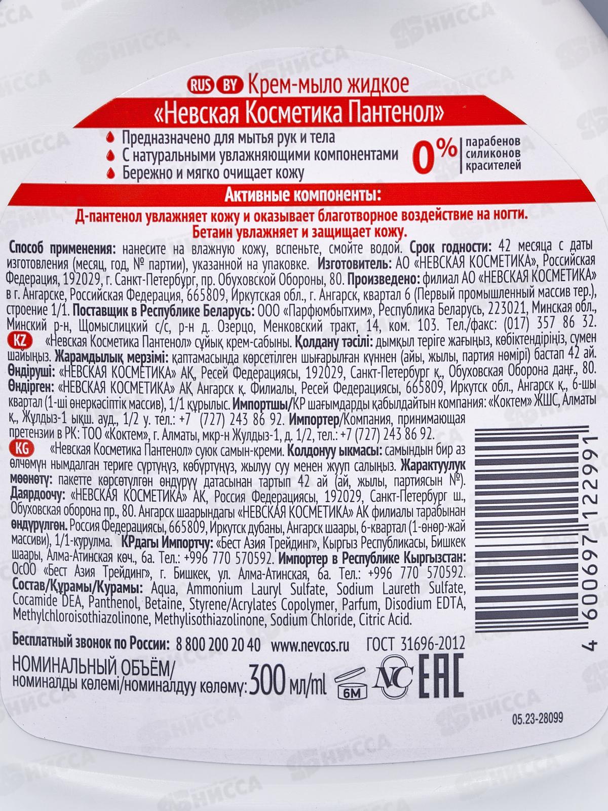 Состав: вода, лаурилсульфат аммония, лауретсульфат натрия, кокамид ДЭА, пантенол, бетаин, сополимер стирола и акрилатов, отдушка, динатрий ЭДТА, метилхлоризотиазолинон, метилизотиазолинон, хлорид натрия, лимонная кислота.