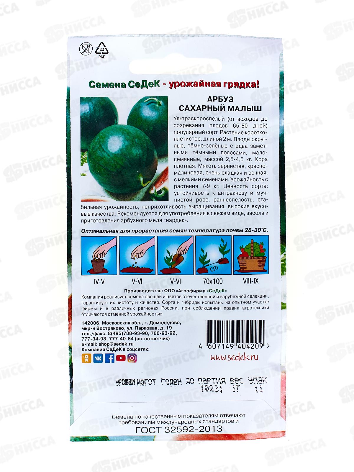 Ультраскороспелый (от всходов до созревания плодов 65-80 дней) популярный сорт. Растение коротко-плетистое. Плоды округлые, малосемянные, тёмно-зелёные, с едва заметными тёмными полосами, массой 2,5-4,5 кг. Кора плотная. Мякоть зернистая, красно-малиновая, очень сладкая и сочная, с мелкими семенами. Урожайность с растения 8-10 кг. Ценность сорта: устойчивость к антракнозу и к мучнистой росе, неприхотливость выращивания. Назначение универсальное.