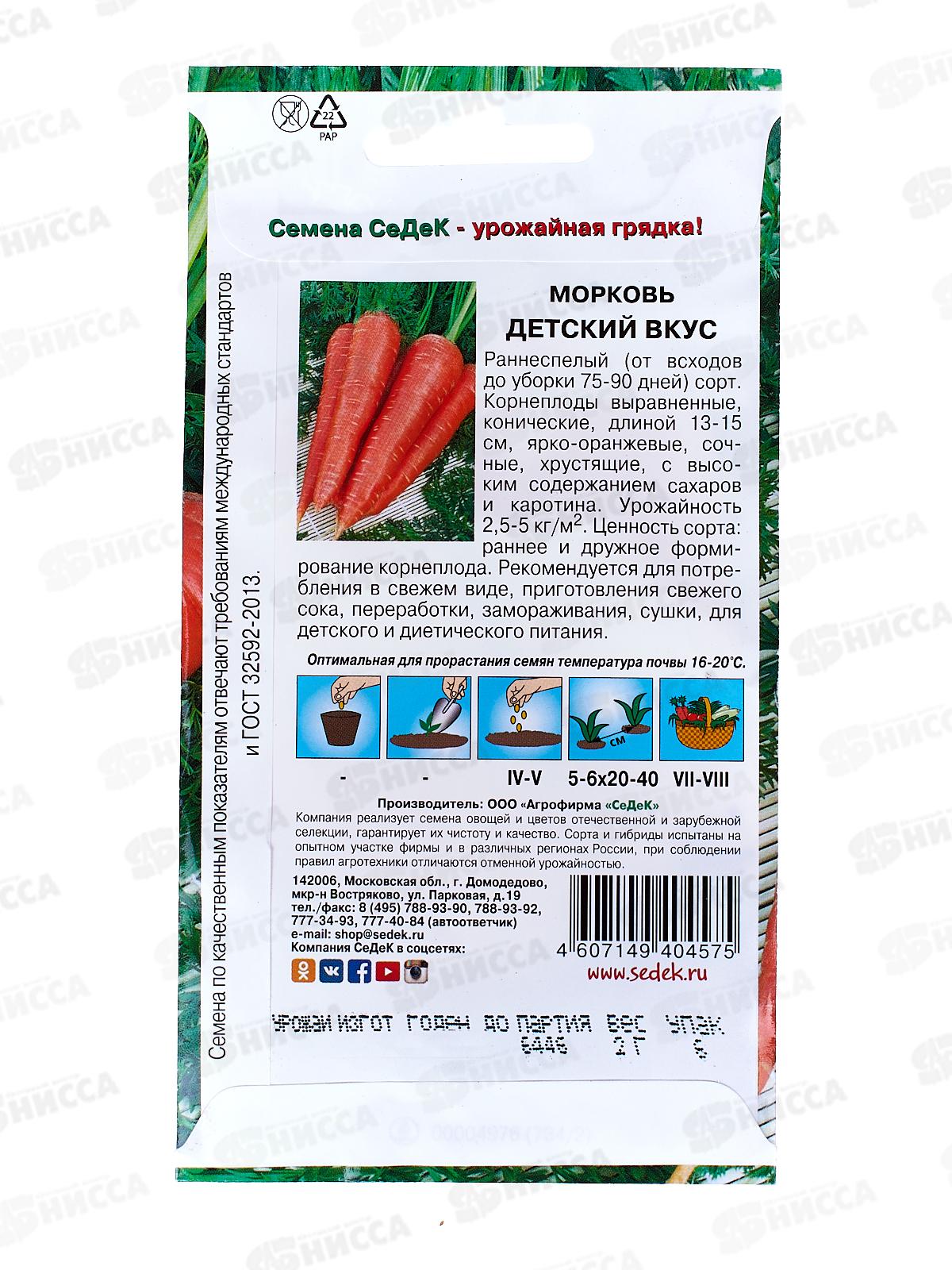 Раннеспелый (от всходов до уборки 75-90 дней) сорт. Корнеплоды выравненные, конические, длиной 13-15 см, ярко-оранжевые, сочные, хрустящие, с высоким содержанием сахаров и каротина. Урожайность 2,5-5 кг/м2. Ценность сорта: раннее и дружное формирование корнеплода. Рекомендуется для потребления в свежем виде, приготовления свежего сока, переработки, замораживания, сушки, для детского и диетического питания.