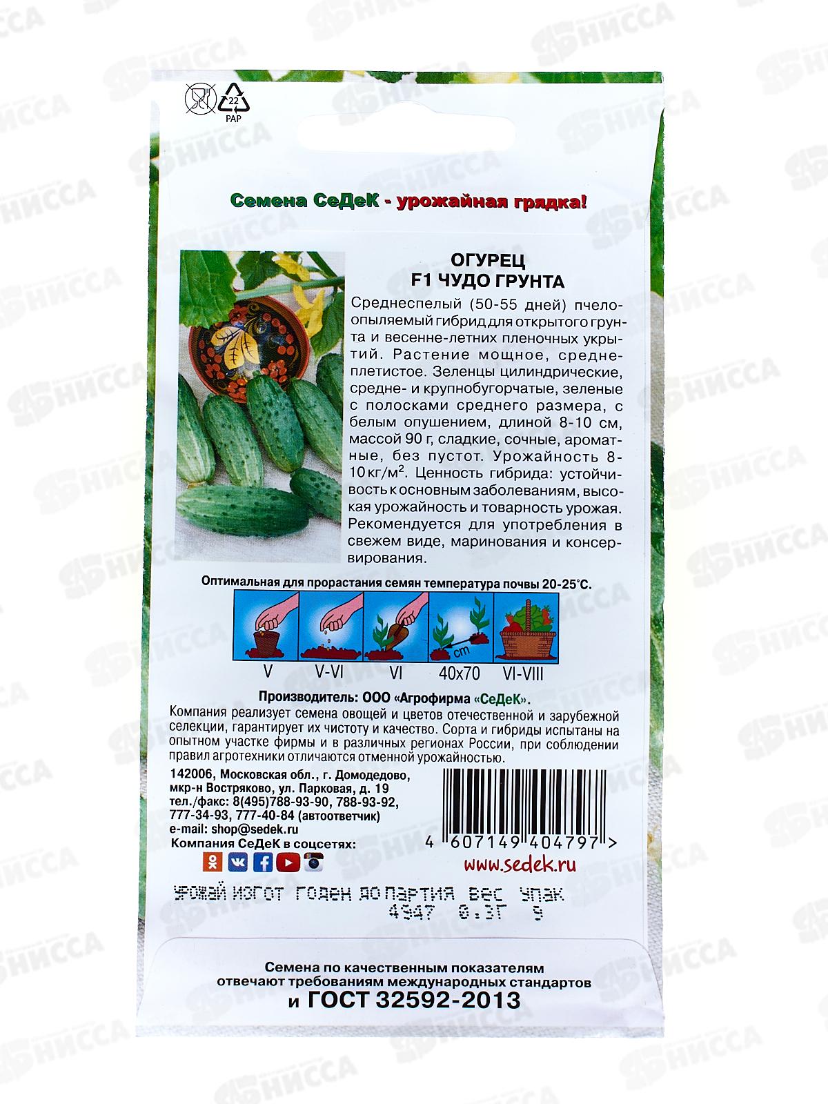 Среднеспелый (50-55 дней) пчелоопыляемый гибрид для открытого грунта и весенне-летних пленочных укрытий. Растение мощное, среднеплетистое. Зеленцы цилиндрические, средне - и крупнобугорчатые, зеленые с полосками среднего размера, с белым опушением, длиной 8-10 см, массой 90 г, сладкие, сочные, ароматные, без пустот. Урожайность 8-10 кг/м?. Ценность гибрида: устойчивость к основным заболеваниям, высокая урожайность и товарность урожая. Рекомендуется для употребления в свежем виде, маринования и консервирования.