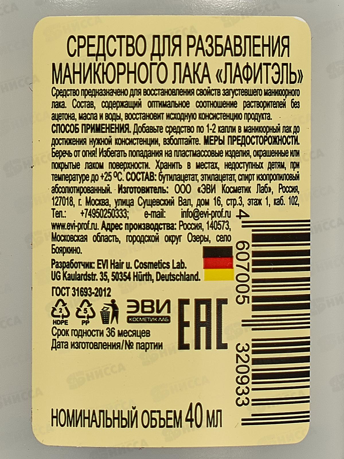 Средство для разбавления маникюрного лака Lafitel, предназначено для восстановления свойства загустевшего лака для ногтей. Жидкость содержит оптимальное соотношение растворителей, не содержит ацетона, масла и воды, поэтому она не меняет структуры лака. Цвет остаётся насыщенным. Рекомендации по применению: добавить немного средства во флакон с лаком и взболтать. При необходимости добавить разбавителя до нужной консистенции. Состав: этилацетат, бутилацетат, спирт изопропиловый абсолютированный.