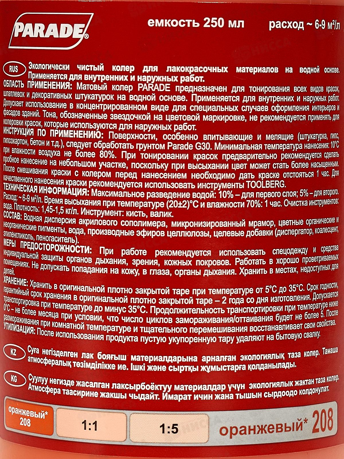 Экологически чистый колер для лакокрасочных материалов на водной основе. Для внутренних и наружных работ. Предназначен для тонирования всех видов красок, шпатлевок и декоративных штукатурок на водной основе. Допускает использование в концентрированном виде для специальных случаев оформления интерьеров и фасадов зданий. Тона, обозначенные звездочкой на цветовой маркировке, не рекомендуется применять для колеровки красок, которые используются для наружных работ. Обладает отличной атмосферостойкостью, светостойкостью, прочностью к истиранию. При тонировании красок предварительно рекомендуется сделать пробное нанесение на небольшом участке, поскольку при высыхании цвет может стать более насыщенным. Для колеровки лакокрасочных материалов на водной основе. Отличная атмосферостойкость и светостойкость. Высокая стойкость к истиранию.