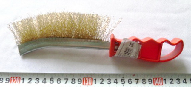 Металлическая щетка с пластиковой ручкой с проволокой оптимальной жесткости. За счет этого увеличивается легкость и качество очистки.