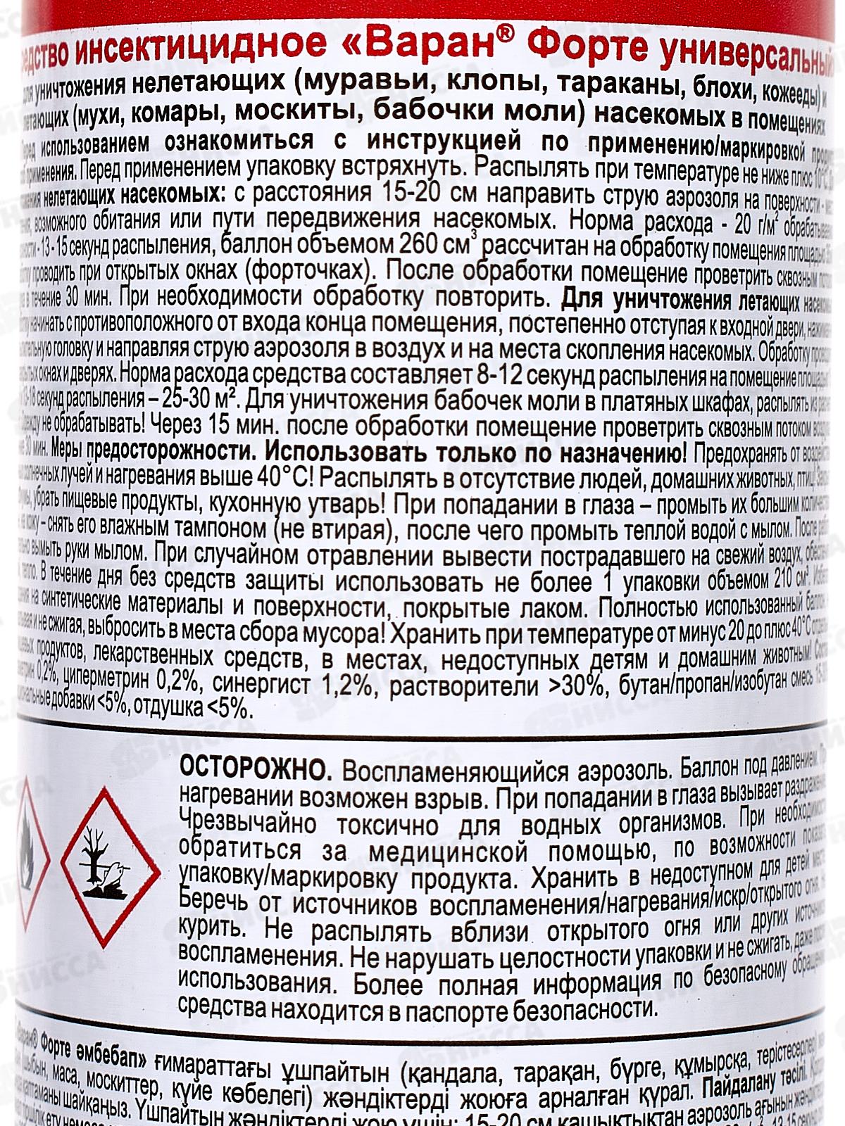 Состав: тетраметрин 0,2%, циперметрин 0,2%, синергист 1,2%, растворители более 30%, бутан/пропан/изобутан смесь 15-30%, функциональные добавки менее 5%.