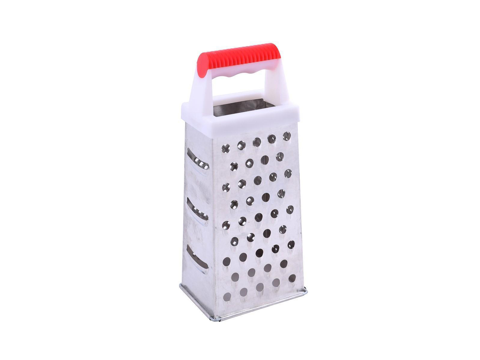 Очень многие блюда содержат измельченные ингредиенты, которые нужно натереть на терке. Универсальным приспособлением для этого станет четырехгранная терка, по двум сторонам которой расположены крупная и мелкая терка для моркови, яиц, лука. По двум другим расположились насечки для получения цедры и три крупных отверстия для нарезки ломтиками. Чтобы натереть продукты, поставьте инструмент на стол, прижмите и удерживайте за ручку одной рукой. Второй рукой натирайте продукты на нужной вам грани. Чтобы не повредить пальцы, натирайте только крупные части продуктов. Рабочая поверхность четырехсторонней терки выполнена из коррозионностойкой стали, ручка – из пластмассы, высота изделия 24 см. Уход за изделием прост: после использования промывайте водой, удаляя щеткой пищевые отходы.