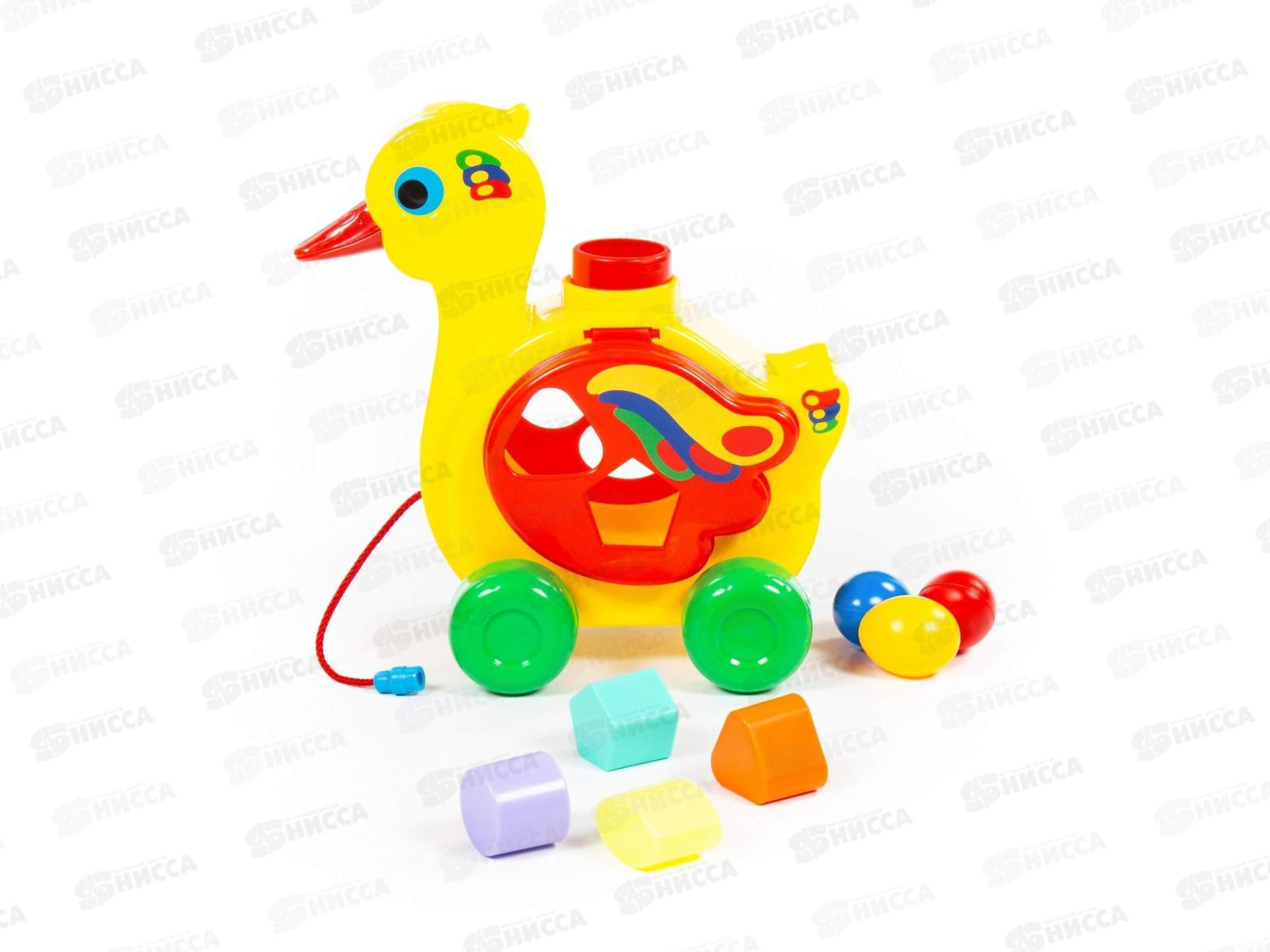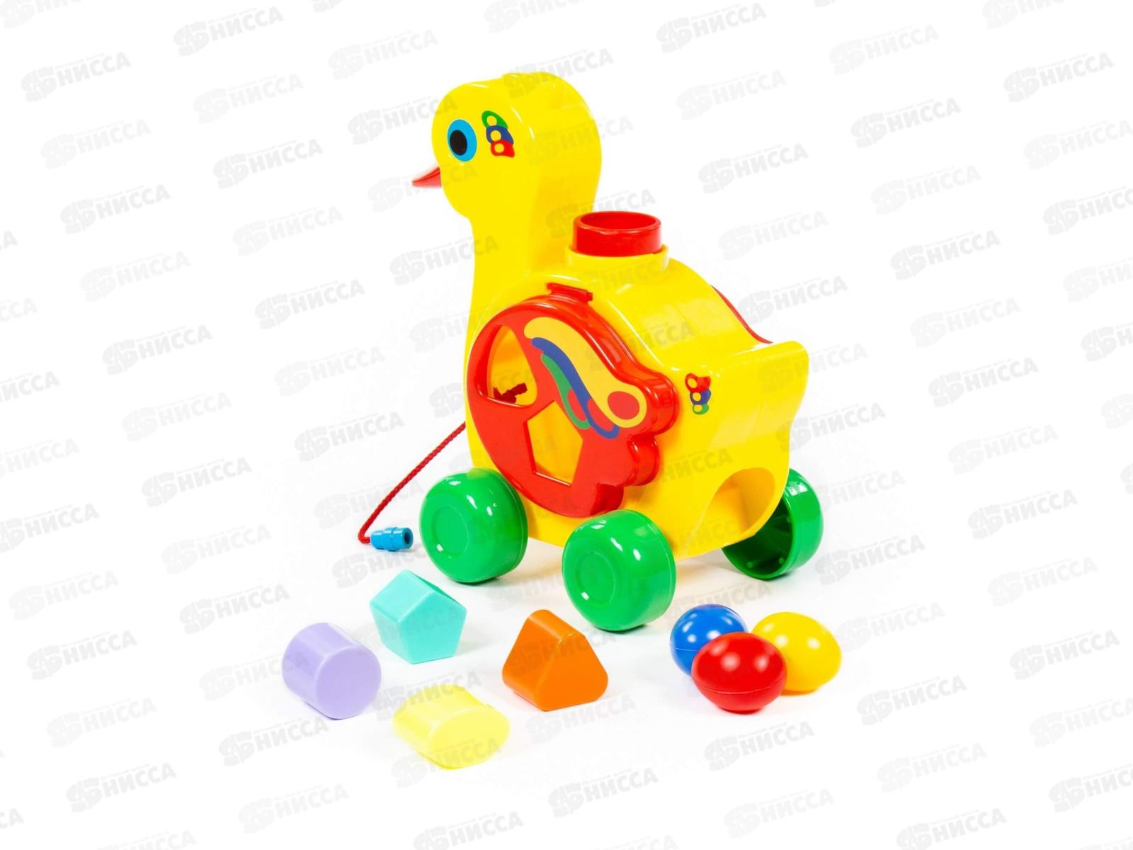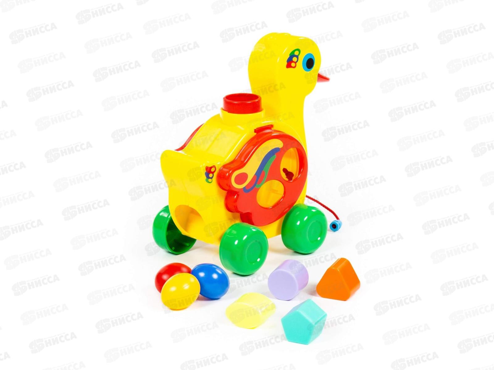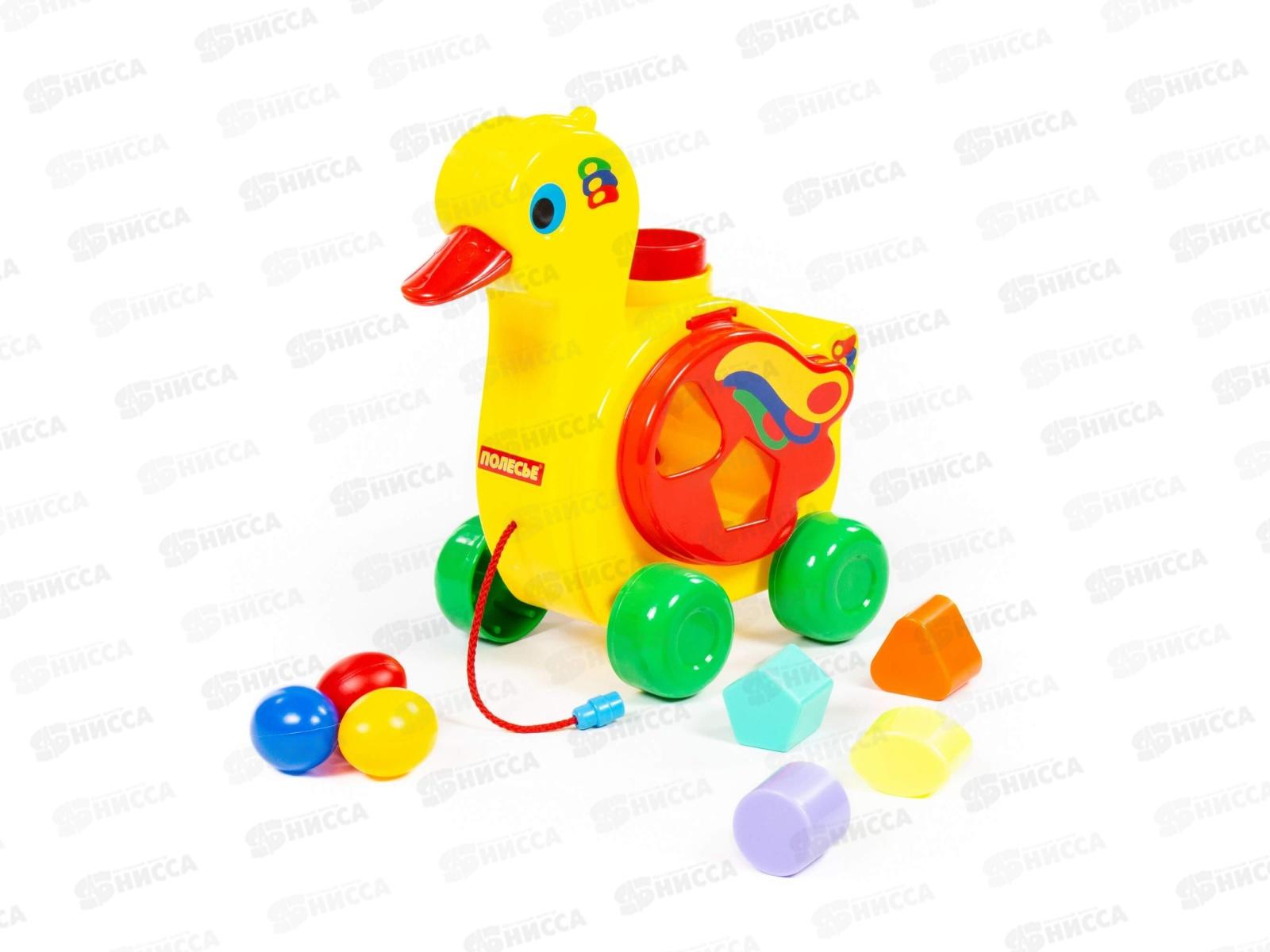 При нажатии на верхний клапан у уточки несушки поднимаются крылья. Если в верхнее отверстие поместить яичко (в комплекте 3 шт.) и нажать на клапан, то оно выскакивает сзади. Каждое крылышко уточки имеет 2 отверстия для логических фигурок, которые в них можно вставлять.