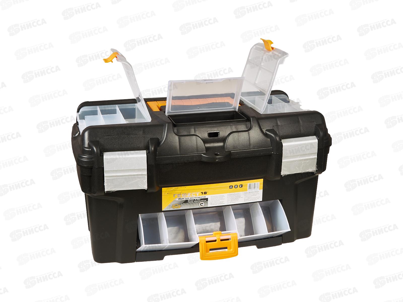 Ящик для инструментов используется для хранения и транспортировки ручного инструмента. В ящике предусмотрен вкладыш для инструментов с внутренними перегородками, вместительное главное отделение позволяет организовать хранение множества инструментов. На крышке расположены 3 практичных органайзера. С лицевой стороны ящика для инструментов расположена функциональная консоль для сортировки мелочей. При изготовлении используется прочный пластик, обеспечивающий длительный срок эксплуатации. Застежки выполнены из металла.